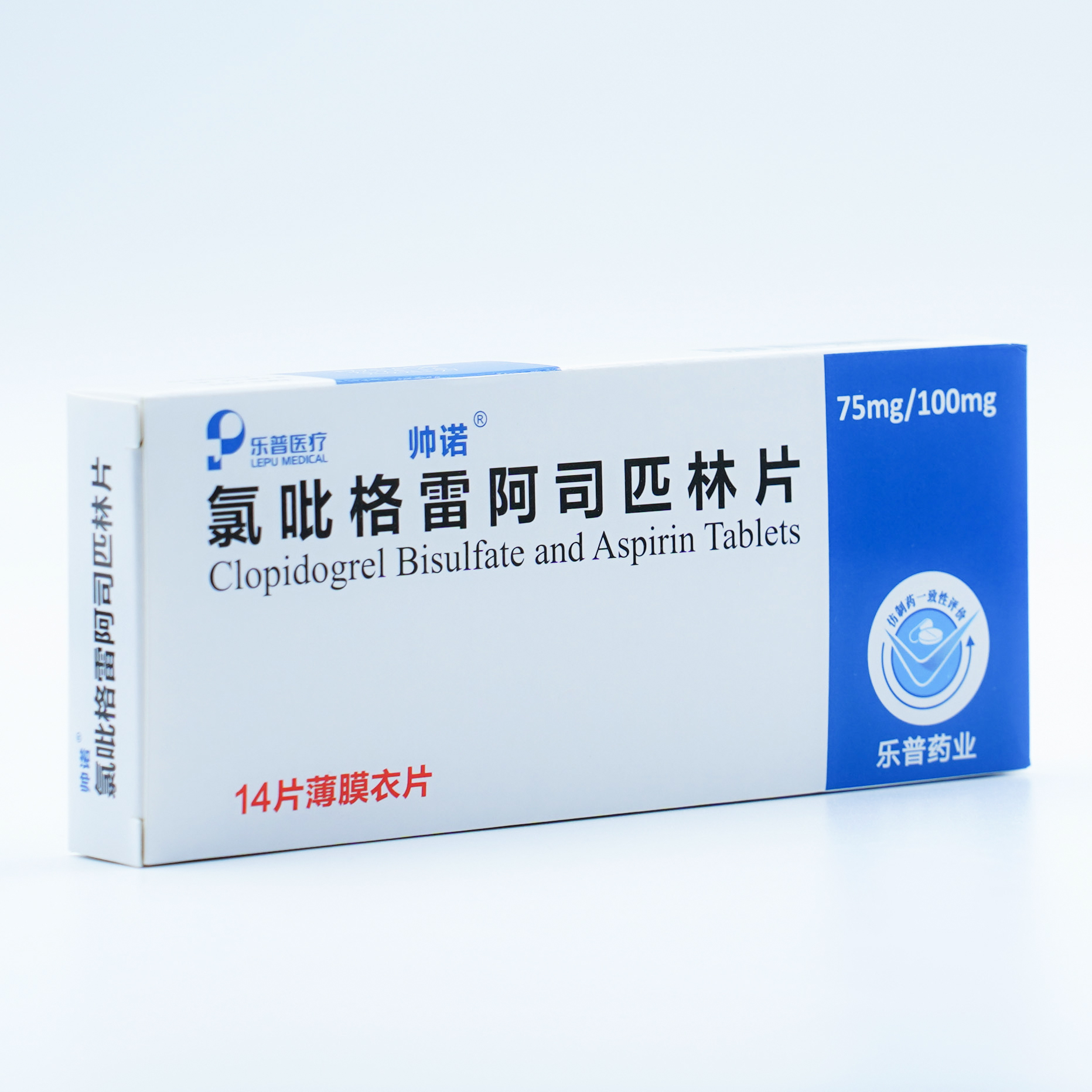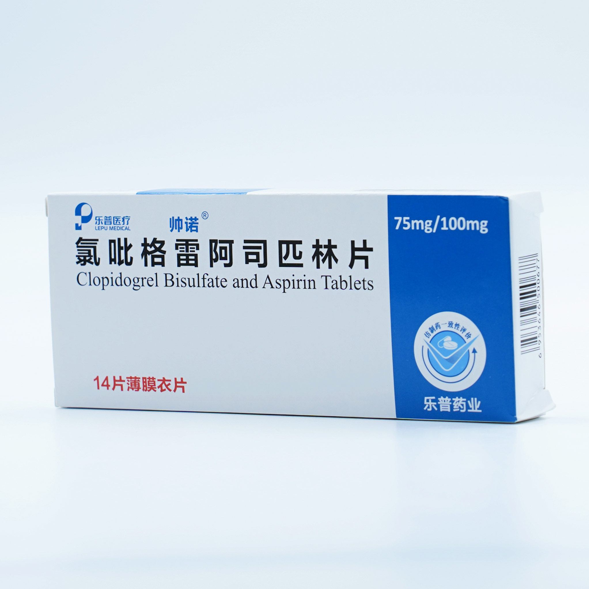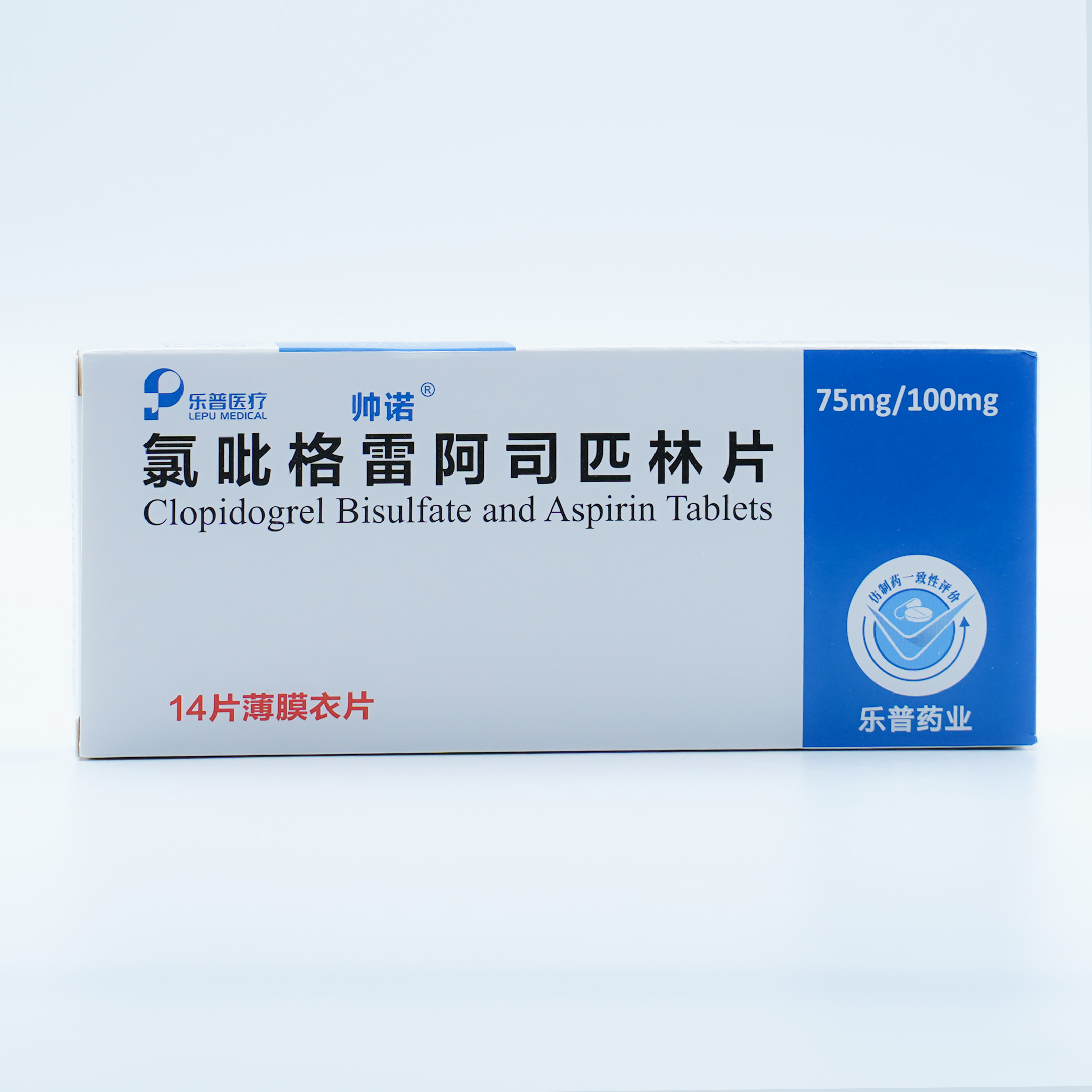【规 格】每片含硫酸氢氯吡格雷75mg(按氯吡格雷计)与阿司匹林100mg。14片/盒。